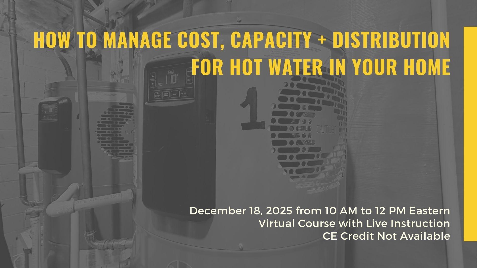 Register now and plan to join us for a live discussion of water heating and distribution. We welcome your questions as we go. We look forward to seeing you in our Zoom presentation from 10 AM to 12 PM Eastern on December 18, 2025!